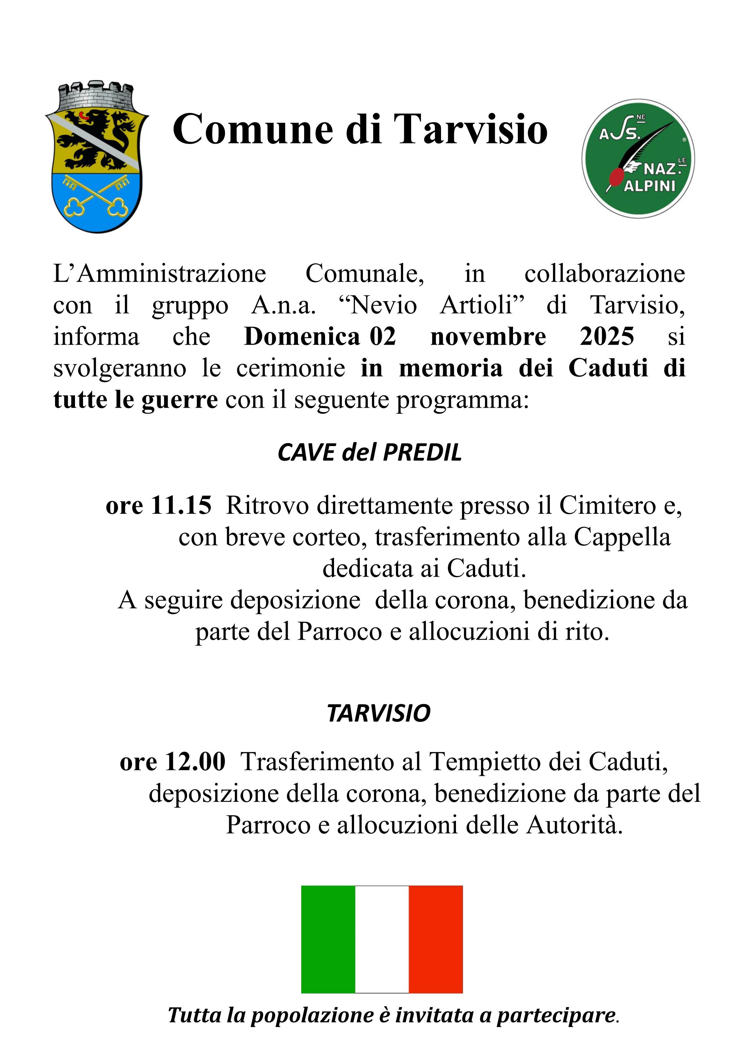 L’Amministrazione Comunale, in collaborazione con il gruppo A.n.a. “Nevio Artioli” di Tarvisio, informa che Domenica 02 novembre 2025 si svolgeranno le cerimonie in memoria dei Caduti di tutte le guerre con il seguente programma: